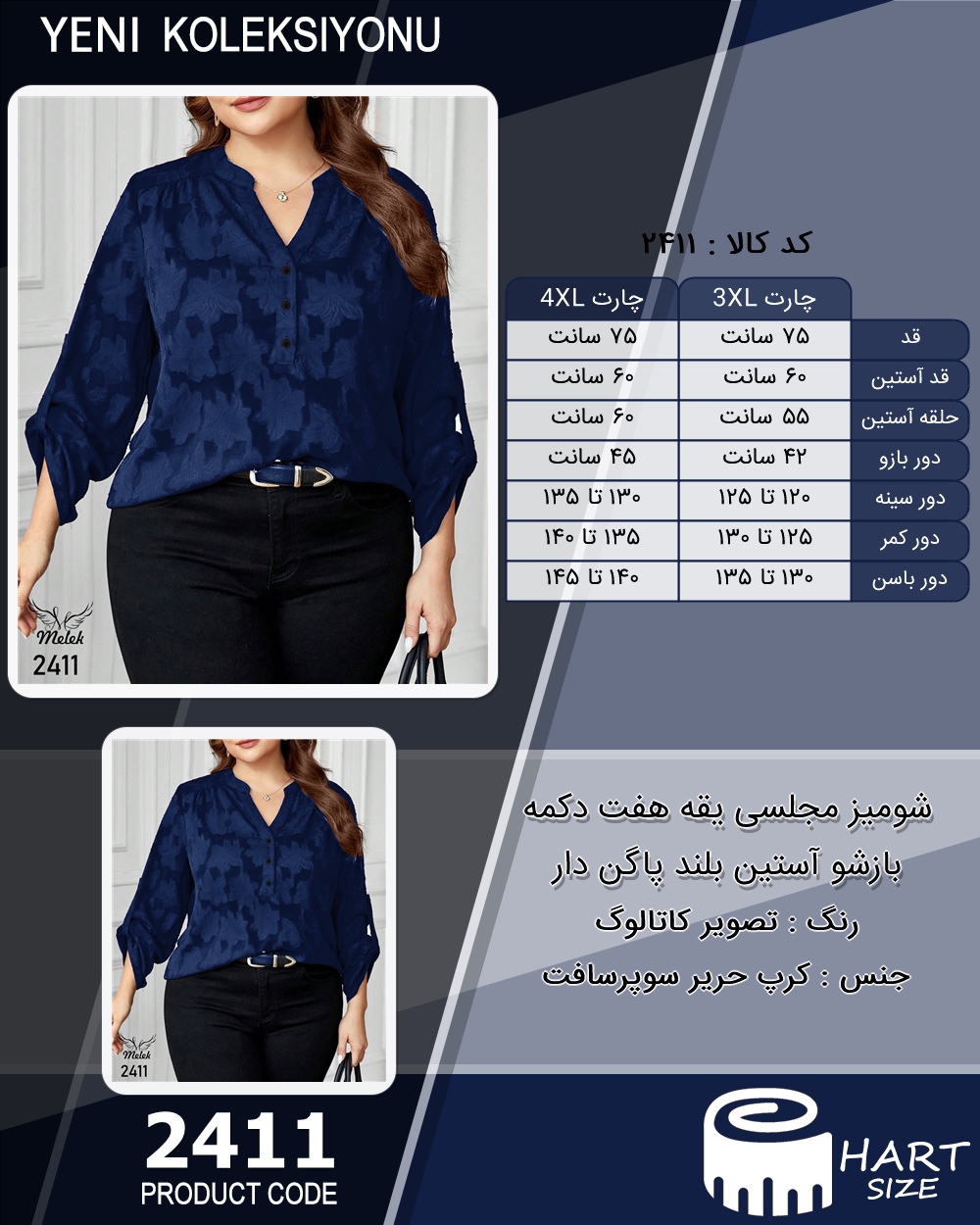 شومیز مجلسی یقه هفت دکمه بازشو آستین بلند پاگن دار سایز بزرگ